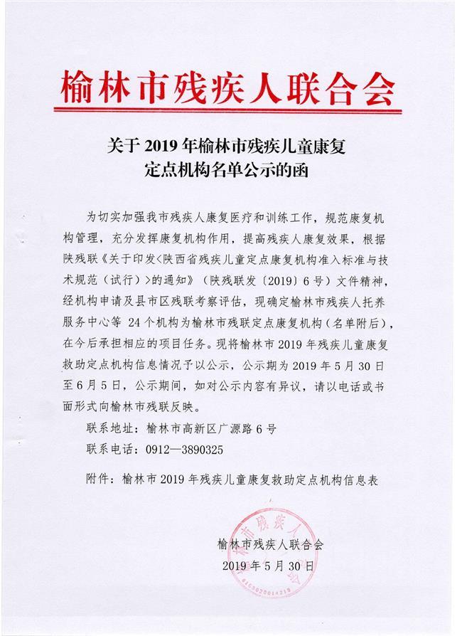 关于2019年榆林市残疾儿童康复定点机构名单公示的函 发布时间:2019-05-30 08:51:00 来源:宣文科 阅读:8327 【 大 中 小 】 扫一扫在手机打开当前页 上一篇: 关于2018年度市本级用人单位按比例安排残疾人就业情况的公示 下一篇: 榆林市残疾人联合会2019年部门综合预算说明