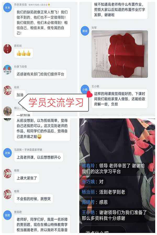 本次线上网络培训班的开班仪式及授课都是通过线上直播进行,通过钉钉软件为残疾人进行在线授课。特邀优秀的剪纸艺人高小连老师为培训老师,重点对剪纸的类别、不同的剪纸技艺和基础理论知识等进行视频授课,大家在视频下留言互动,微信中用语音、图片等形式交流学习,充分调动每位学员的积极性。
