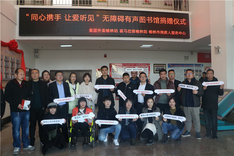 2019年11月22日,榆林市残疾人服务中心联合美团外卖榆林站及喜马拉雅榆林站共同举办了“同心携手 让爱听见”无障碍有声图书馆捐赠仪式。榆林市残疾人服务中心主任王岐鹏、美团外卖总经理李冲波、喜马拉雅项目负责人张升及残疾人代表等出席活动。活动现场,美团及喜马拉雅共同向榆林市残疾人服务中心捐赠了“无障碍有声图书馆”,助力榆林市残联打造残疾人“爱心书屋”。