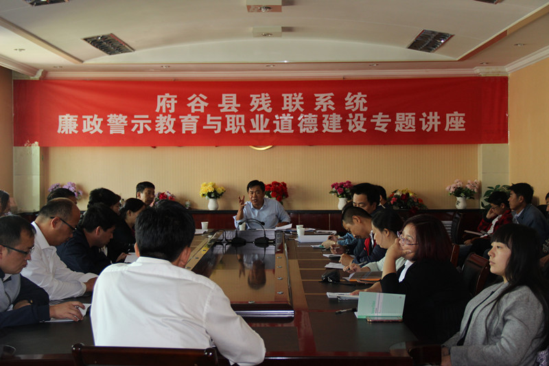 9月29日上午,府谷县残联党支部举办了主题为“坚定信念、忠于国家、服务人民、恪尽职守、依法办事、公正廉洁”的廉政警示教育与职业道德建设专题讲座,邀请了府谷县纪委宣传部部长刘高岗授课,各乡镇残疾人专职委员、县残联干部参加会议。