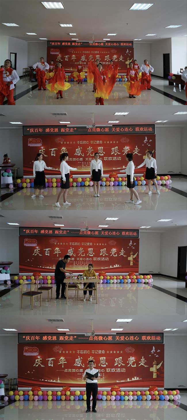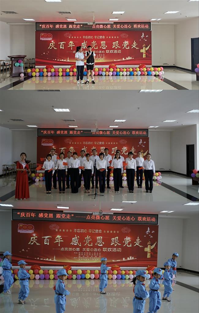 随后,“点亮微心愿、关爱心连心”联欢活动在激情洋溢的开场舞《庆七一》中拉开了序幕。歌曲《没有共产党就没有新中国》、舞蹈《红心闪闪》、诗朗诵《青春的名义》、《我的心》等节目深情回顾了共产党人的峥嵘岁月。整场联欢活动紧紧围绕“庆百年、感党恩、跟党走”这一主题,表演者们倾情演绎,通过歌曲、舞蹈、乐器、朗诵等内容丰富、精彩纷呈的文艺节目热情歌颂党和祖国。联欢活动在大合唱《再唱山歌给党听》中落下帷幕,气势磅礴的歌声令大家热血沸腾、精神振奋,现场掌声经久不息。