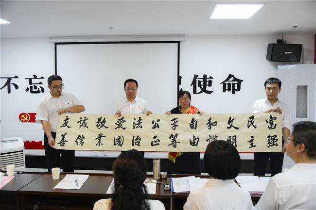 活动期间,市残联全体党员干部起立合唱《公民道德歌》,宣誓践行社会主义核心价值观,并一起观看了谢海琴同志的道德教育短片。随后,谢海琴分享了自己几十年来的奋斗经历,她的事迹感动了许多市残联的党员干部,30余名党员干部纷纷写下了自己的道德感悟卡。冯继虎代表市残联向好人代表谢海琴赠送了书写着社会主义核心价值观24字的书法作品。