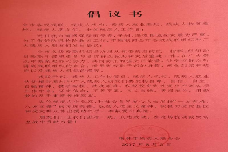 市残联倡议向绥德、子洲灾区捐款 发布时间:2017-08-04 16:09:00 来源:办公室 阅读:4929 【 大 中 小 】 “7.26”我市子洲县、绥德县等地遭遇强降水侵袭,造成百年以来降水量最大、损失最为惨重的特大洪涝灾害。房屋倒塌、桥梁断裂、公路塌陷、良田冲毁、农作物被淹、畜禽死亡,这深深牵动着所有人的心。 8月3日下午,榆林市残疾人联合会理事长王志雄,副理事长牛建斌、韩波、康晓峰带头为绥德、子洲灾区捐献爱心,市残联全体干部职工也纷纷为绥德、子洲捐款,向灾区群众表达关切、献上爱心,用实际行动号召全市残联系统支援灾区,与灾区群众共渡难关。 扫一扫在手机打开当前页 上一篇: 清涧县残联积极向灾区捐款献爱心 下一篇: 绥德残疾志愿者将网友为其捐款3700元全部捐给灾区