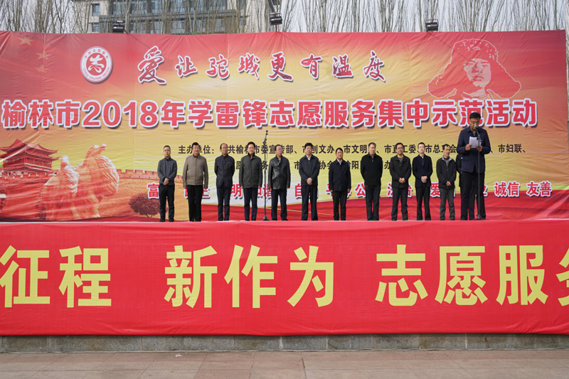 3月 5日上午,榆林市 2018年学雷锋志愿服务集中示范活动在世纪广场正式启动。此次活动以“爱让驼城更有温度”为主题,旨在进一步培育志愿服务文化,传承雷锋精神,推动社会各界广泛传播“行善立德”志愿服务理念,积极参与学雷锋志愿服务活动,践行社会主义核心价值观,塑造友爱互助、和谐幸福的榆林新风尚。出席本次活动的领导有,榆林市慈善协会会长刘洪,榆林市委宣传部常务副部长、榆林日报社社长康爱军,榆林市民政局副局长刘世斌,榆林市直工委副调研员折建春,榆林市总工会副主席高卫林,榆林共青团榆林市委副书记刘江涛,榆林市文明办副调研员曹海峰,榆林市残联副理事长韩波,榆林市文广局副调研员胡华滨,榆林市环保局副调研员李生伟,榆林市交警支队纪委书记杜树彪。启动会由榆林市委宣传部副部长刘斌主持。