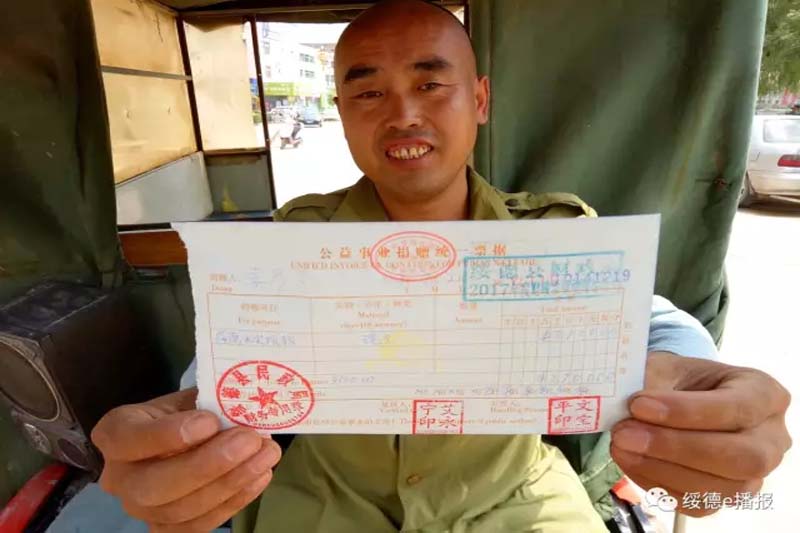 接过捐赠票据,看到上面写着“绥德水灾捐款”,李彦飞高兴地说:“这下好了,又有很多受灾群众可以吃顿热乎饭了。”