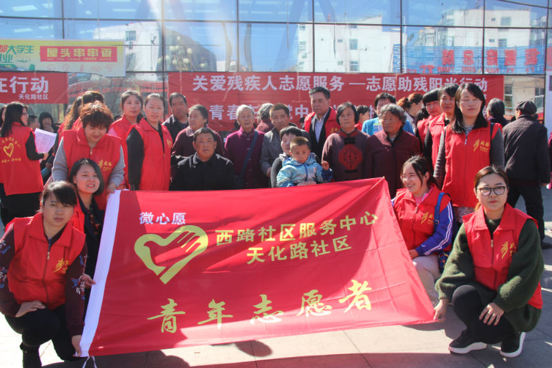 2017年3月30日,我县残联、西路社区携手,共同组织开展 “关爱残疾人志愿服务-志愿助残阳光行动”,西路社区志愿者服务站组织50多名青年志愿者进行了发放宣传单、讲解残疾人法律知识和优惠政策等多种形式的服务活动,并为上百名残疾人发放了“社区是我家,建设靠大家”专用纪念品。