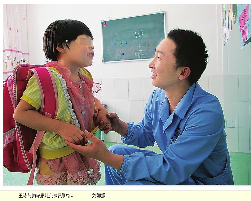 最让他难忘的是患儿高萌萌,9岁的她患有严重脑瘫,刚进院时躺在床上不会蹬腿,平衡能力弱,日常动作都无法进行,家人既痛心又焦急。担任高萌萌主治康复技师的王涛看在眼里、急在心上,通过一系列认真评估后,为她制定了日常训练方案,从最基本的辅助训练开始,一点一滴地培养运动能力。有一次进行搭桥训练,高萌萌怎么都掌握不了,家长也急得又哭又骂,王涛耐心地安抚他们,慢慢地纠正孩子的动作。“孩子也不愿意这样,我们一定要耐心细心,才能让她一点点学会技能。”经过3个月的康复训练,现在萌萌已能扶着栏杆慢慢走路了。第一次看见女儿迈出小腿,萌萌的妈妈热泪盈眶:“我们想都不敢想,娃娃进步这么大。王医生人虽然年轻,可心地好,对娃娃康复训练既认真又耐心,有时我们都看着心疼啊!”