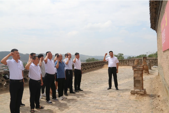 第三站来到镇川镇刘家湾村榆林县政府旧址,在讲解员的介绍下,大家详细了解了镇川支部、中共镇川区委、中共米佳镇中心县委员会的建立,镇川党组织遭到破坏、解放镇川等历史沿革;深刻感受朱子休、朱侠夫、朱敏、申国藩等老一辈无产阶级革命家在中国共产党领导下展现出的不怕牺牲、不畏艰险的大无畏革命精神。在鲜红的党旗下,大家再次庄严宣誓,重温入党誓词。