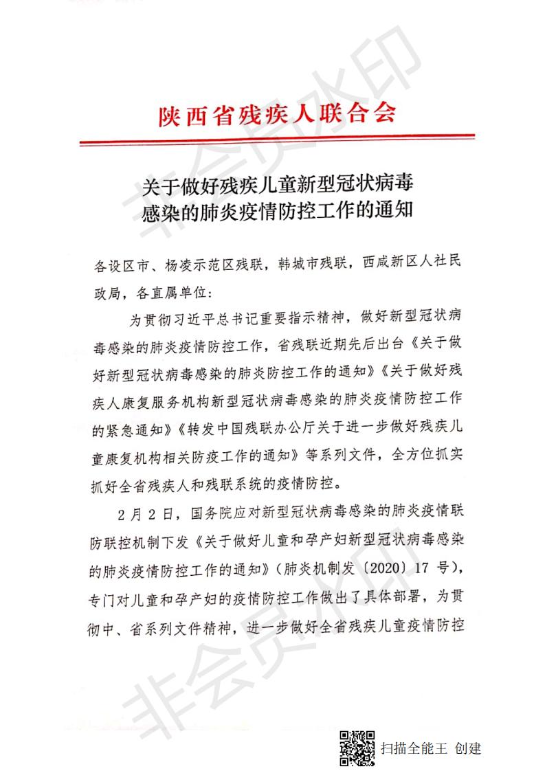 关于做好残疾儿童新型冠状病毒感染的肺炎疫情防控工作的通知 发布时间:2020-02-04 18:11:00 来源:宣文科 阅读:2995 【 大 中 小 】 扫一扫在手机打开当前页 上一篇: 市残联积极组织参加2020年全市义务植树活动 下一篇: 倡议书