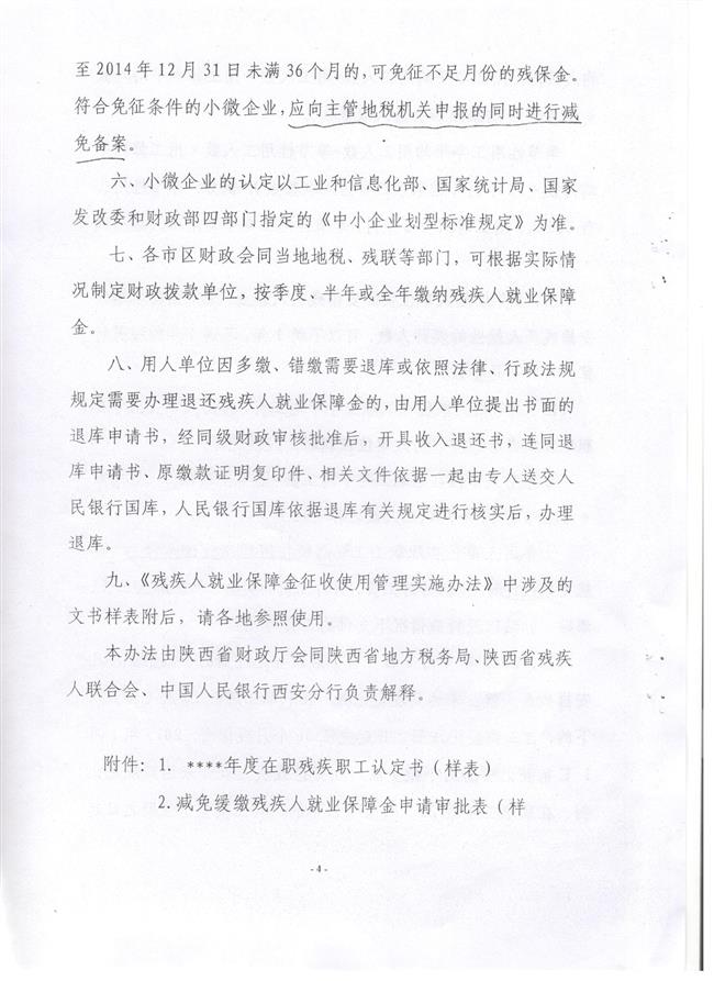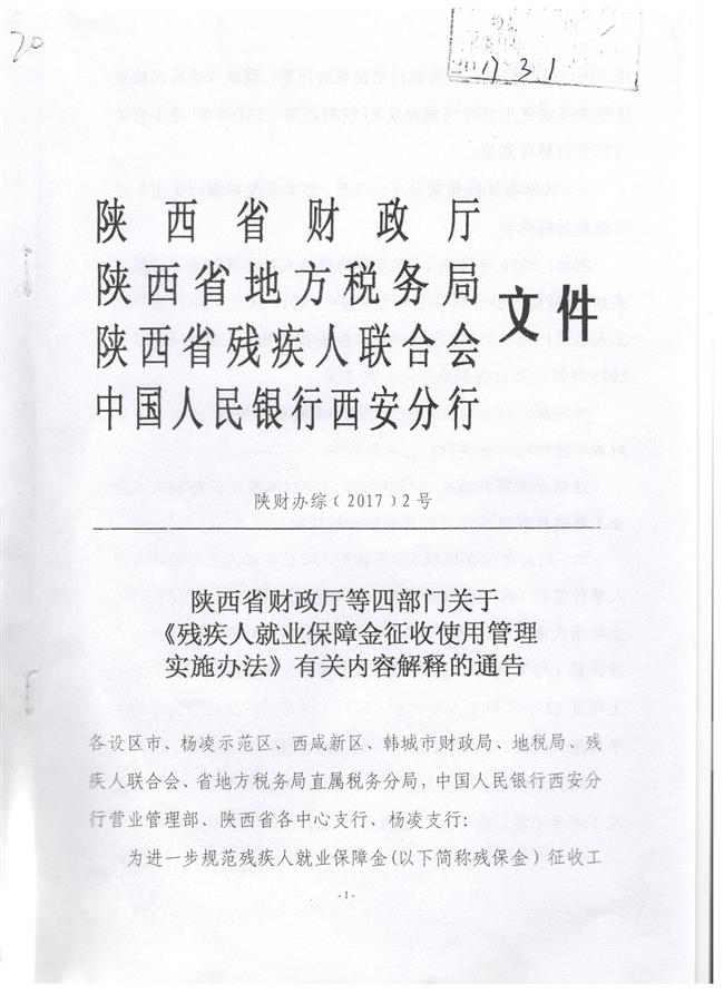 陕西省财政厅等四部门关于《残疾人就业保障金征收使用管理实施办法》有关内容解释的通告 发布时间:2018-12-13 15:01:00 来源:办公室 阅读:8258 【 大 中 小 】 扫一扫在手机打开当前页 上一篇: 府谷县残联投资50万元实施无障碍 下一篇: 米脂县残联免费为听障残疾人配备助听器