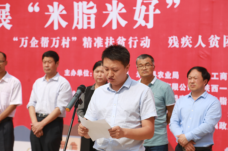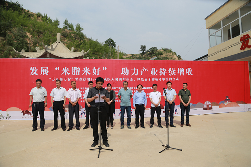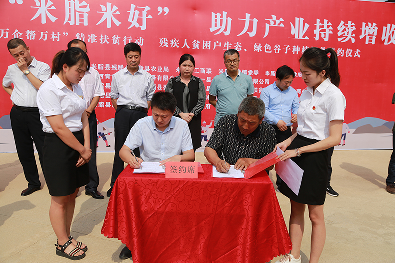 为响应“万企帮万村,精准扶贫”的号召,加快区域贫困户脱贫步伐,增加残疾人贫困户的收入。2018年6月1日下午2点,由米脂县残联主办的““万企帮万村”精准扶贫在行动”——残疾人贫困户与生态、绿色谷子种植订单签约仪式在米脂县桃镇王坪村隆重举行。米脂县人大副主席高辰凯,米脂县县委常委统战部部长谢恩莲,米脂县残联理事长贺爱民,米脂县桃镇党委书记张学亮,陕西省青创联盟电子商务有限公司总经理张雄彪,桃镇副科级以上领导干部,全体驻村干部,贫困残疾人种植户代表等参加了此次活动。